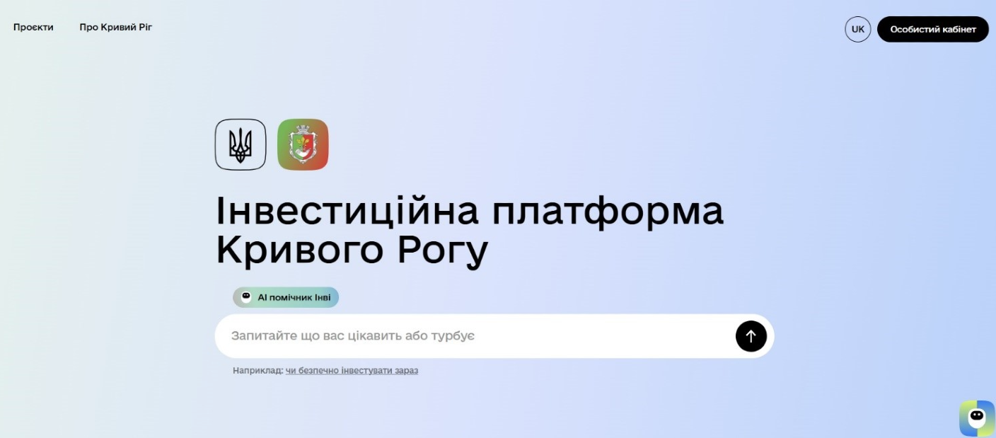 Інвестиційна платформа проєктів Кривого Рогу — офіційна онлайн-платформа, створена для залучення інвестицій, підвищення прозорості реалізації міських проєктів та формування довіри. Платформа містить актуальну інформацію про інвестиційні ініціативи міста, дає змогу інвесторам і партнерам швидко знайти потрібні проєкти, ознайомитися з умовами участі, надіслати пропозицію та отримати супровід. Мешканці можуть бачити, як розвивається місто, які кошти залучено та на що їх витрачають.